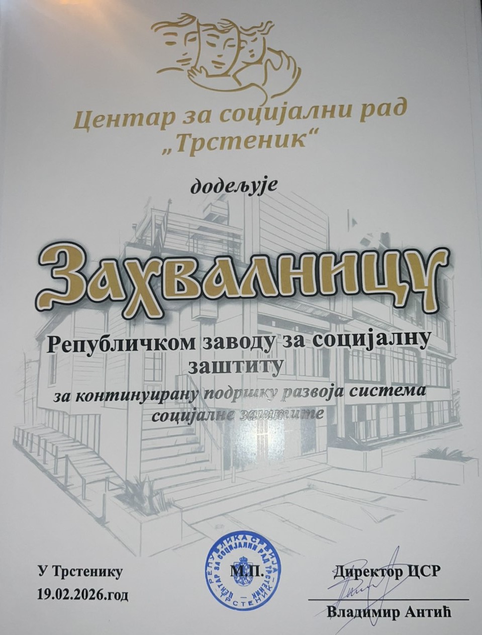Републичком заводу за социјалну заштиту је поводом 60 година постојања и рада Центра за социјални рад Трстеник додељена Захвалница за континуирану подршку развоју система социјалне заштите.